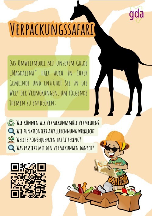 Nutzen Sie die Gelegenheit das Umweltmobil vom GDA zu erleben und lassen Sie sich am Informationsstand über Verpackungsmüll und Abfalltrennung aufklären.